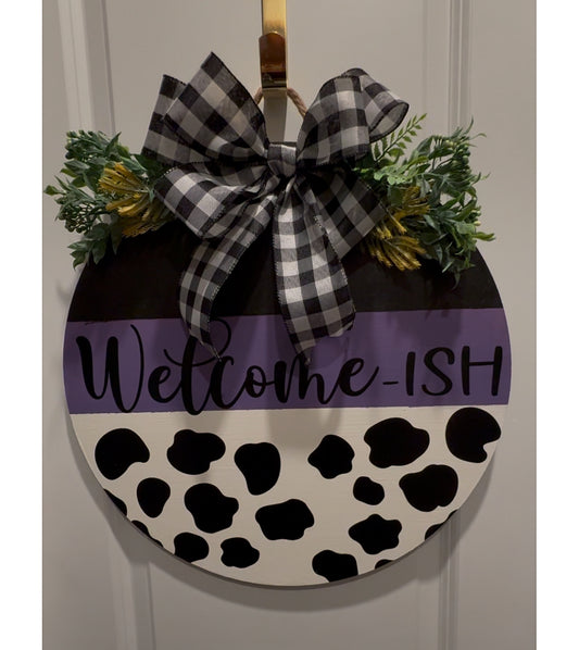 Welcome-ish Custom Cow Print Door Hanger with "Welcome-ISH" Text and Decorative Elements - Hanging